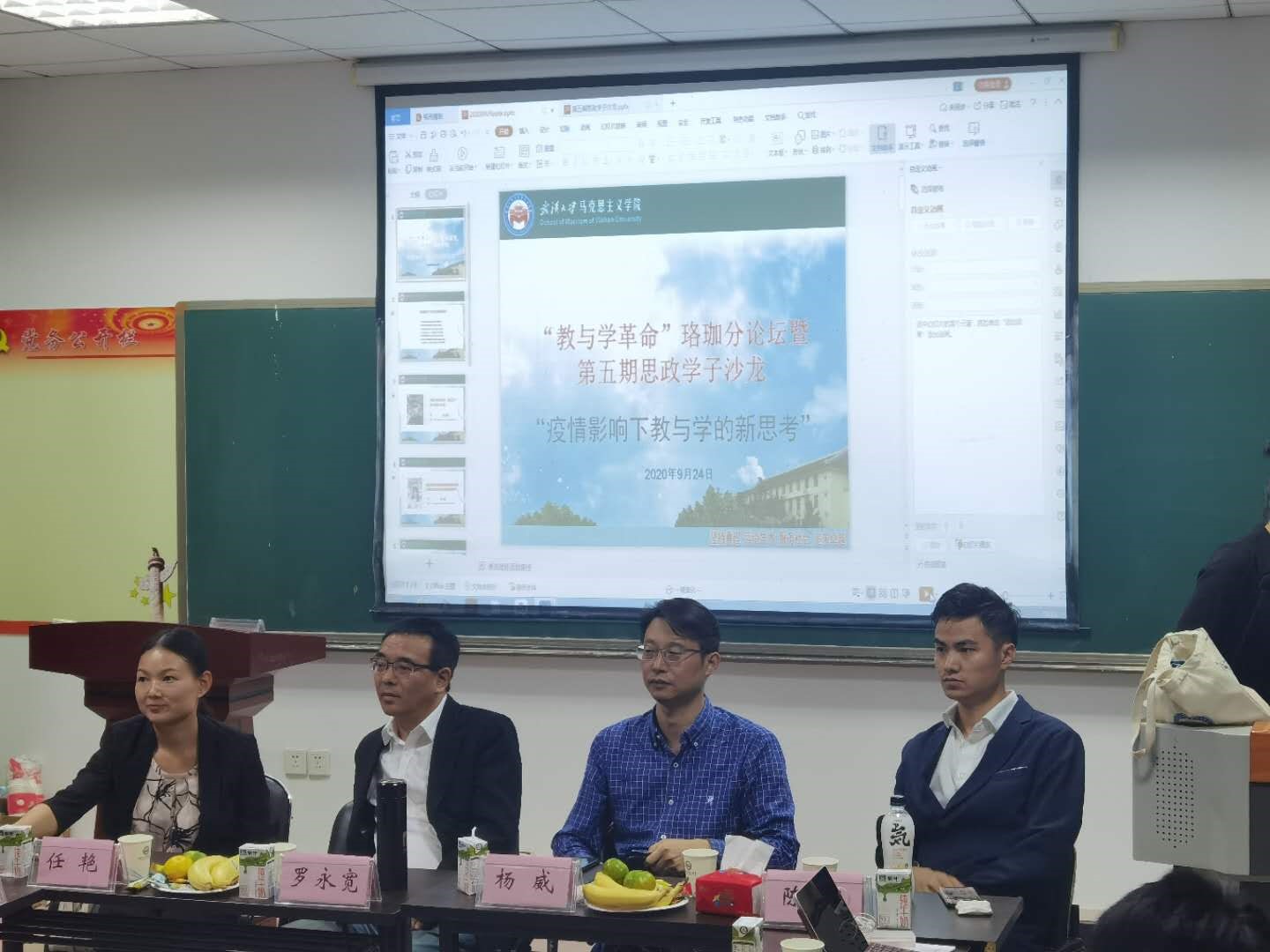 9月24日晚,以“疫情影响下教与学的新思考”为主题的“教与学革命”珞珈分论坛暨第五期思政学子沙龙在学院319室成功举行。学院副院长罗永宽教授、杨威教授,学院周绍东教授、任艳老师、陈武老师出席了本次活动。思想政治教育专业本科生张仕豪、李若童,硕士研究生韩宇彤,博士研究生耿春晓、田祥茂、黄晶晶先后作了主题发言。学院思政课后备人才计划部分博士生和硕士生参加了此次沙龙。本次活动由2019级博士研究生张一苇同学主持。