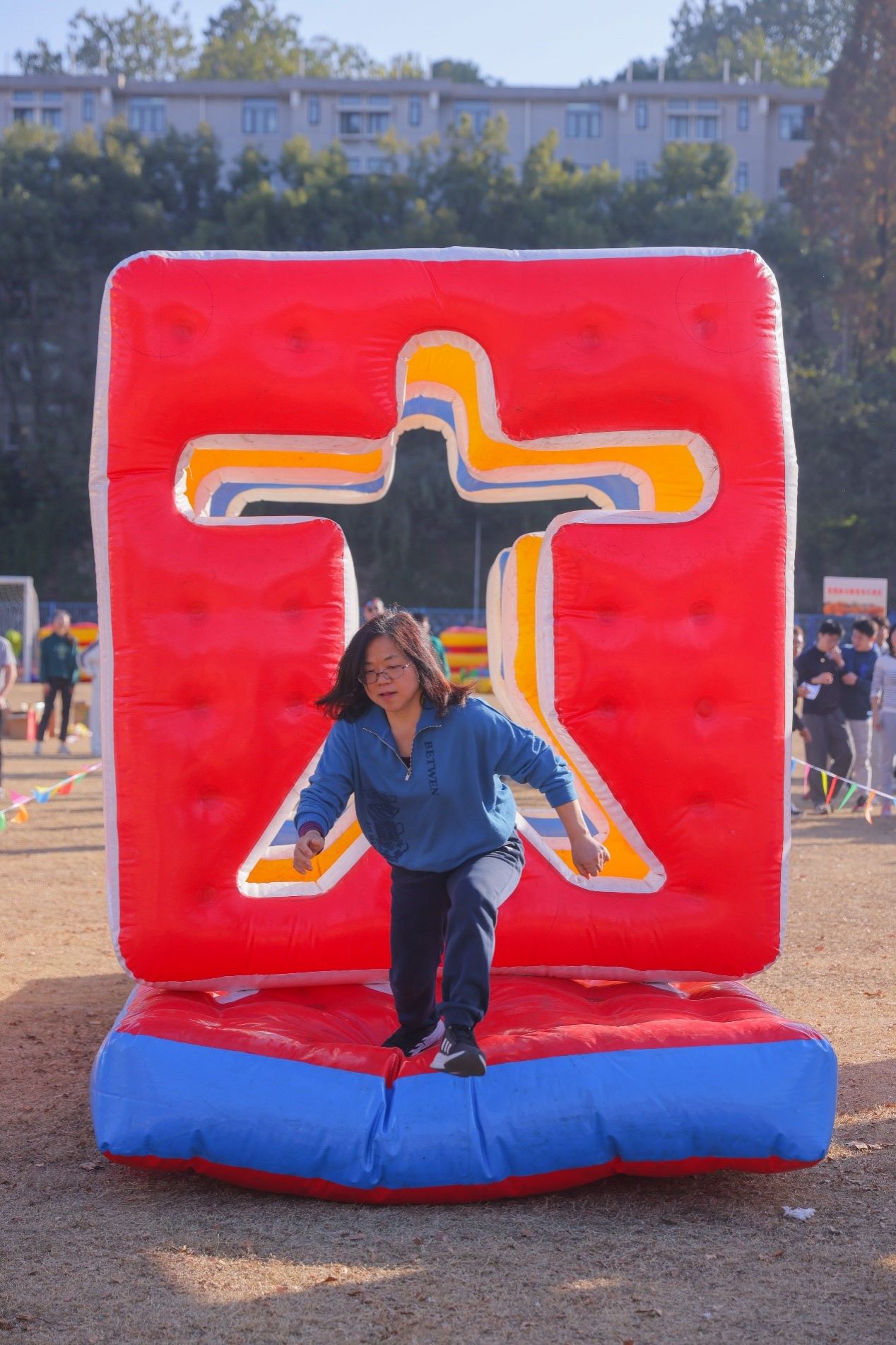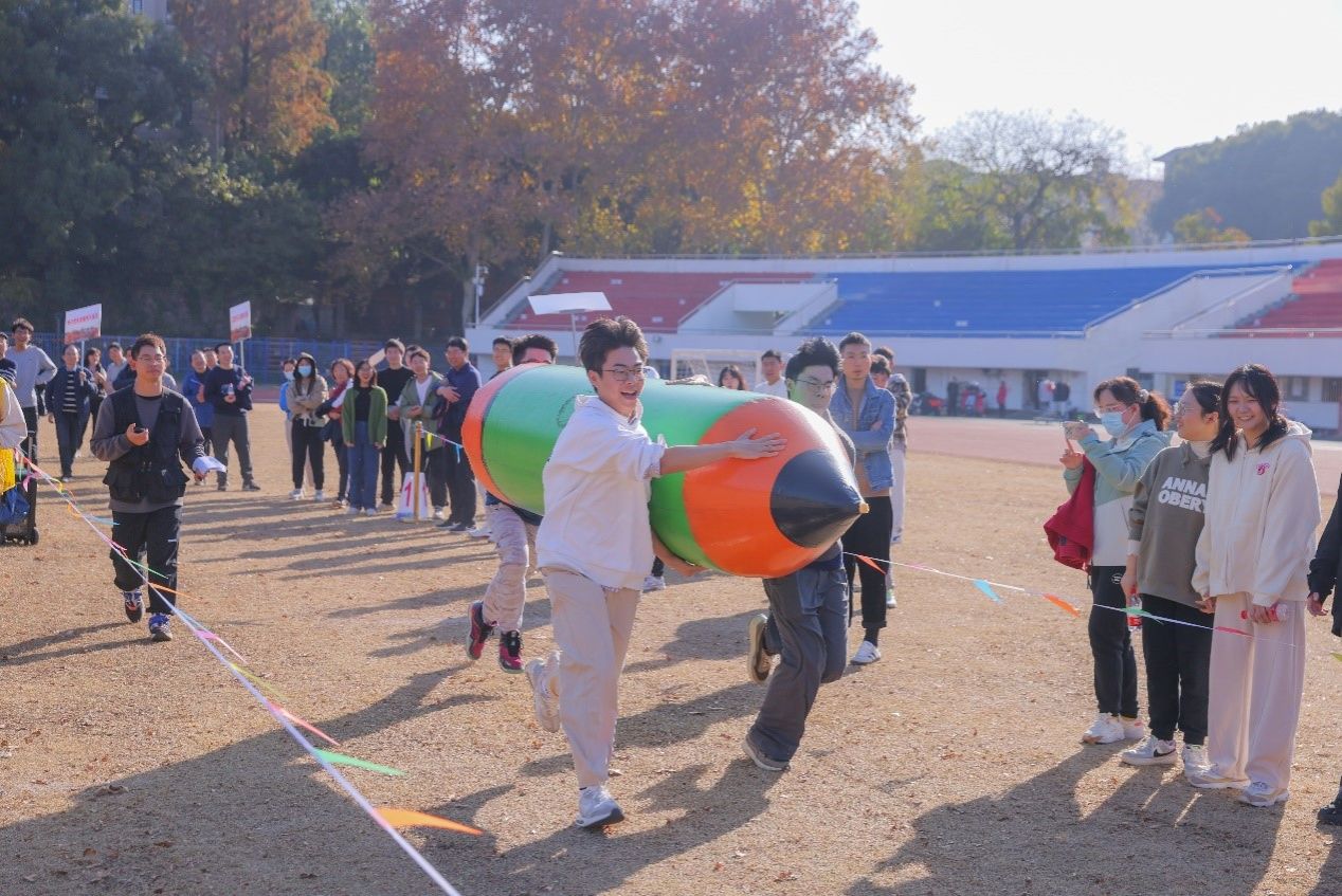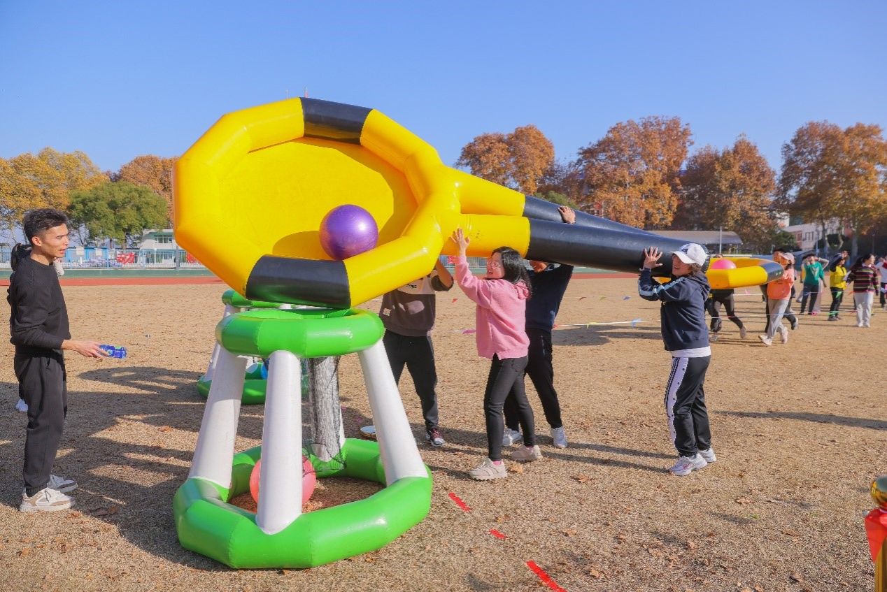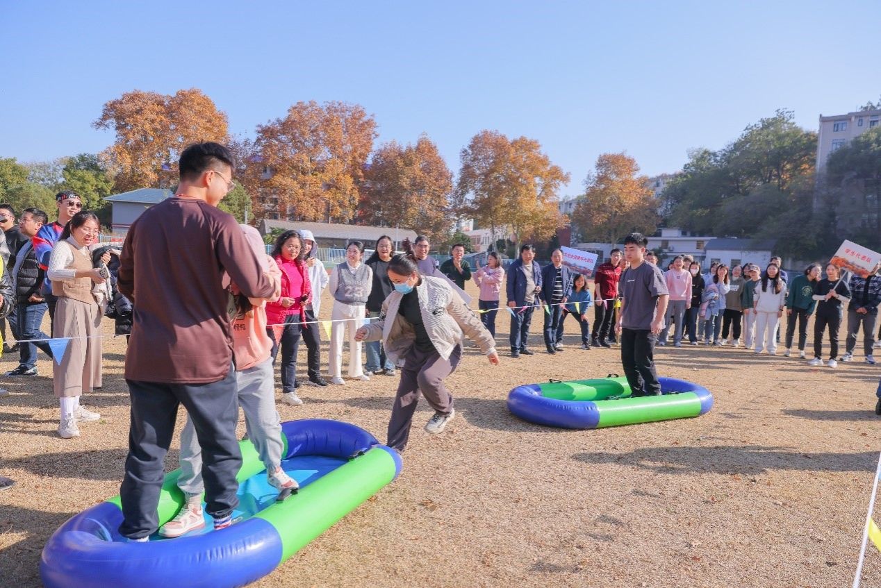 共设6个趣味比赛项目:龙行天下、风雨同舟、十拿九稳、穿越人墙、携手共进,均需要团队协作完成。主持人引领大家热身后,六支队伍相继完成六个项目的比拼,师生们在玩乐中进行体育锻炼,在体育锻炼中凝聚团结精神,在繁忙的工作和学业中放松自己。