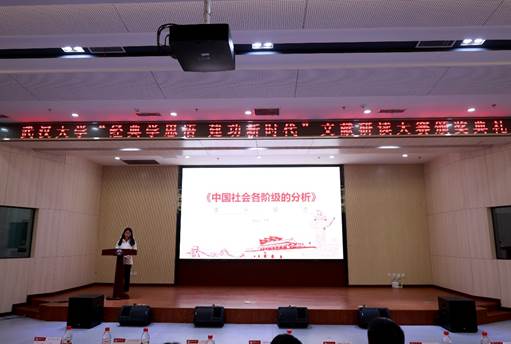 典礼第三项,读书报告展示和二等奖颁发。来自经济与管理学院的王博同学为大家展示经典文献《中国社会各阶级的分析》的读书报告。