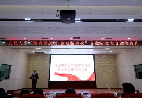 党委书记张全友充分肯定此次大赛的重要意义并宣读获奖名单。张全友强调,读原著、悟原理是一个常读常新、常悟常新的过程,从经典作品中获得奋进新时代的思想资源和精神动力,是助力当代青年大学生成长为堪当民族复兴重任的时代新人的重要方式。本次研读大赛经过“概论”教研中心全体教师的精心组织和推选,共评选出147篇获奖作品,其中一等奖15名,二等奖30名,三等奖61名,优秀奖41名。张全友宣读获奖名单并对获奖同学表示祝贺。