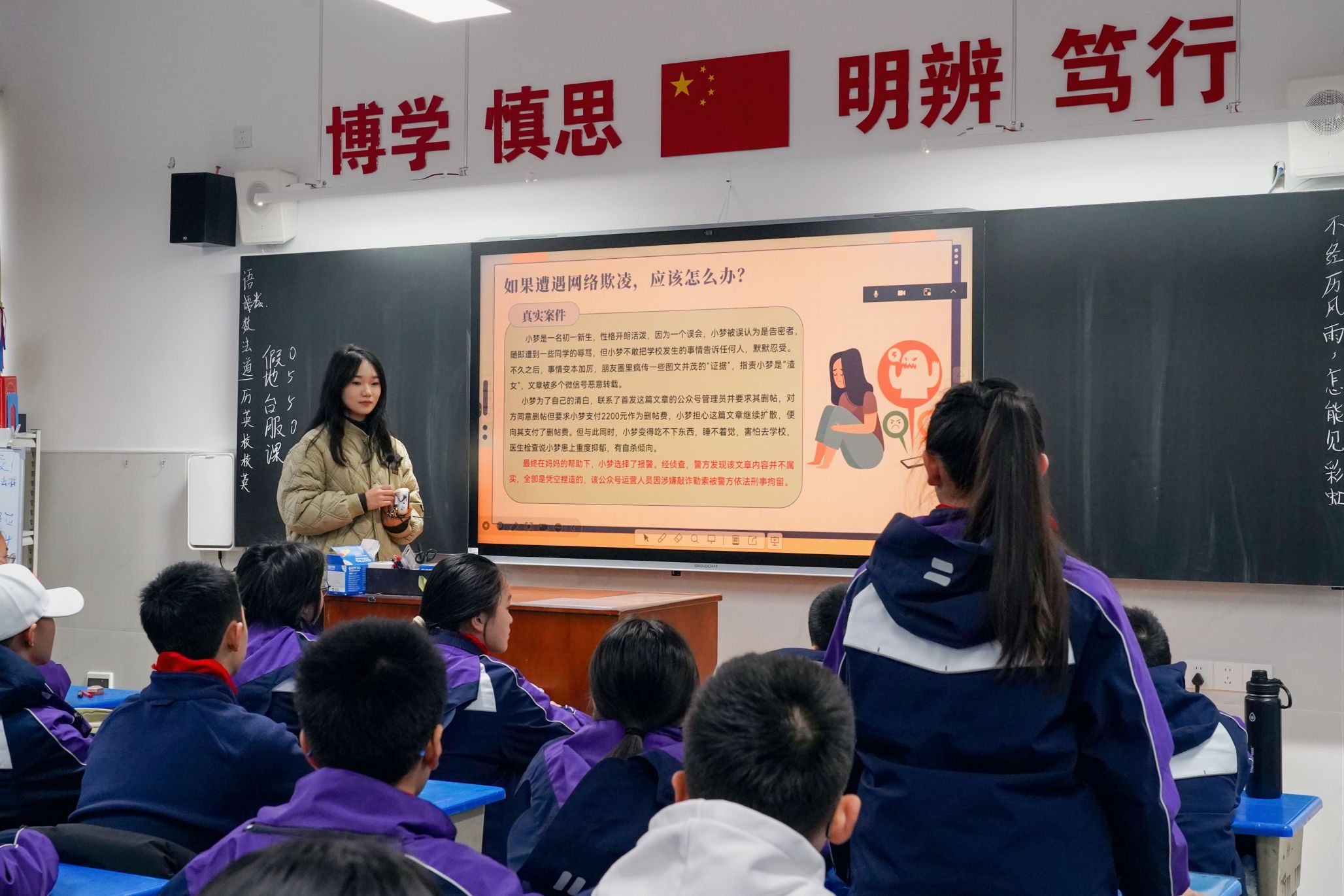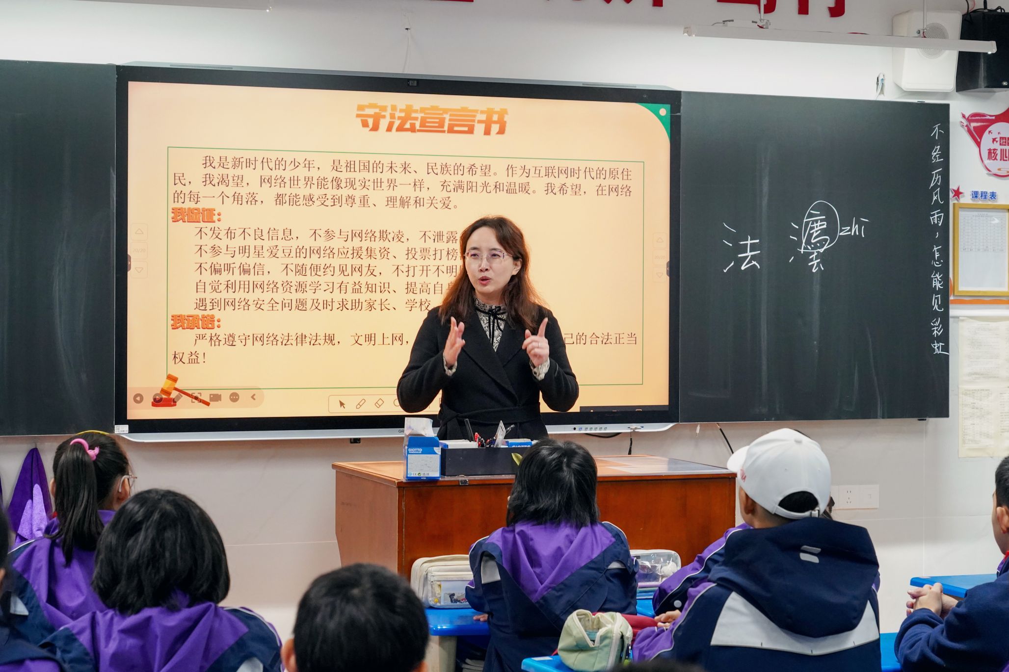 附属外语学校七年级10班道德与法治课堂,以《未成年人网络保护条例》为主题,为师生们带来一场别开生面且极具教育意义的普法盛宴。本次活动是“国家宪法日”特别主题课堂活动之一。同学们认真听讲,积极思考,主动回答问题。此次普法活动的开展,不仅让初中学生深入了解了《未成年人网络保护条例》,增强了他们的网络安全意识与法律素养,助力未成年人健康成长,也为大中小思政一体化教育模式的实践提供了优秀范例。