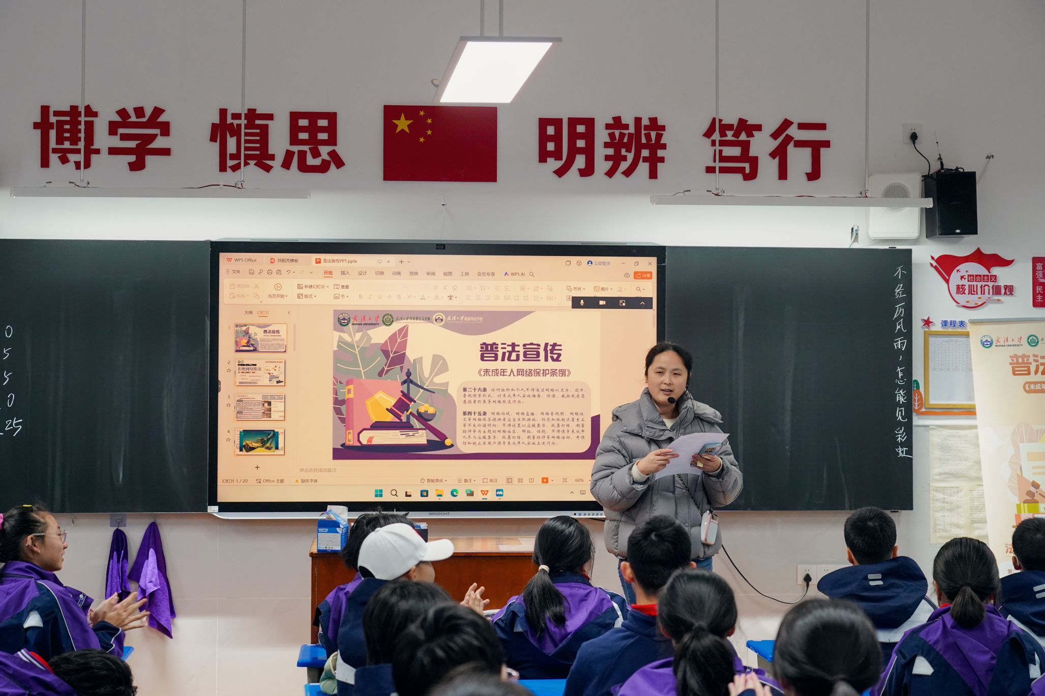 陈慧女老师根据两位研究生同学的讲授内容作了总结发言。她指出,道德与法治都是调节人与人关系的社会规范,是我们每个人的行为准则。与道德不同,法律是由国家强制力保证实施且具有普遍约束力的社会规范。网络空间同现实社会一样,我们既要提倡自由,也要保持秩序。正如习近平总书记说的那样:“网络空间不是‘法外之地’”,同学们应当严格遵守网络法律法规,文明上网,自觉形成运用法律手段维护自身权益的思维和习惯。