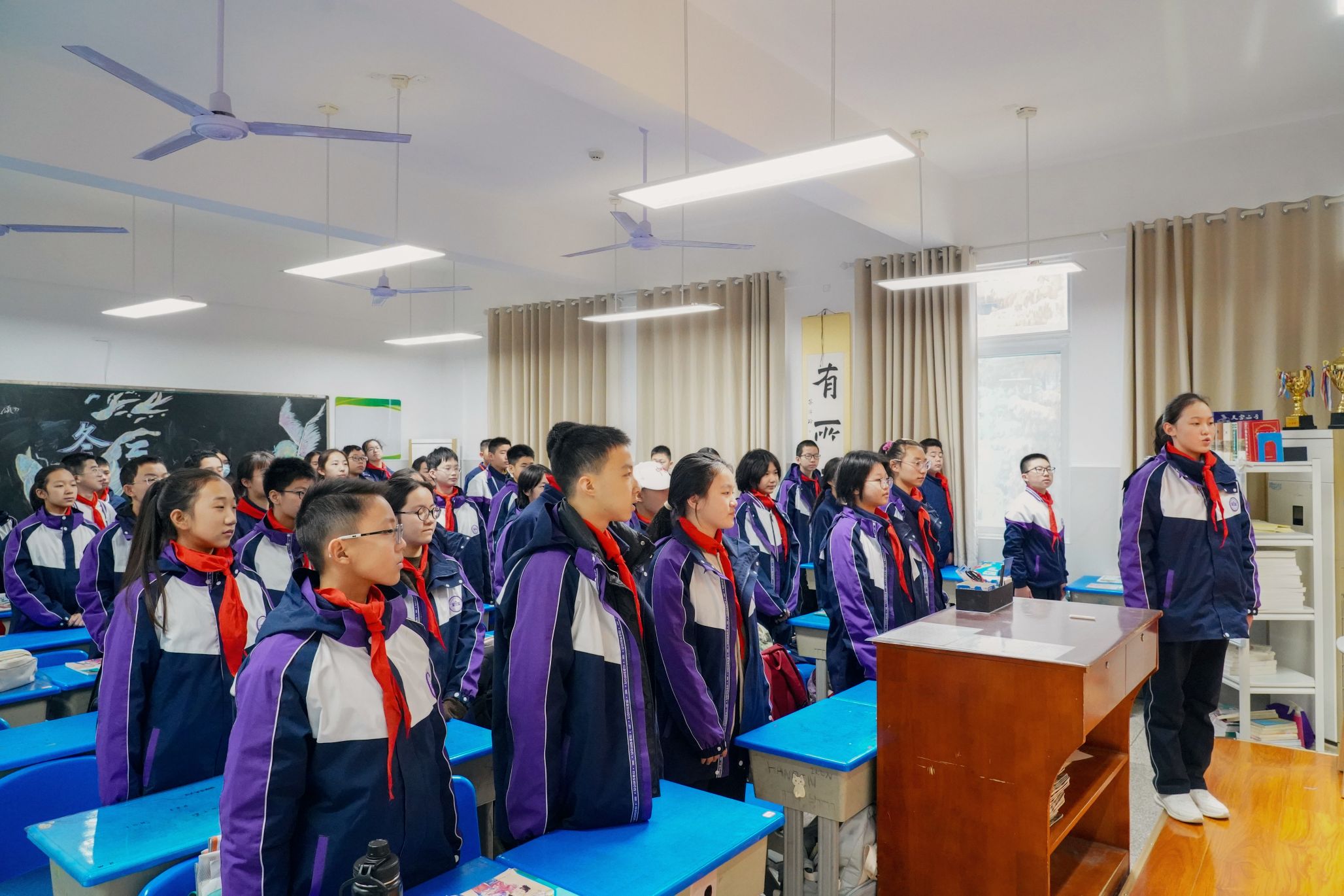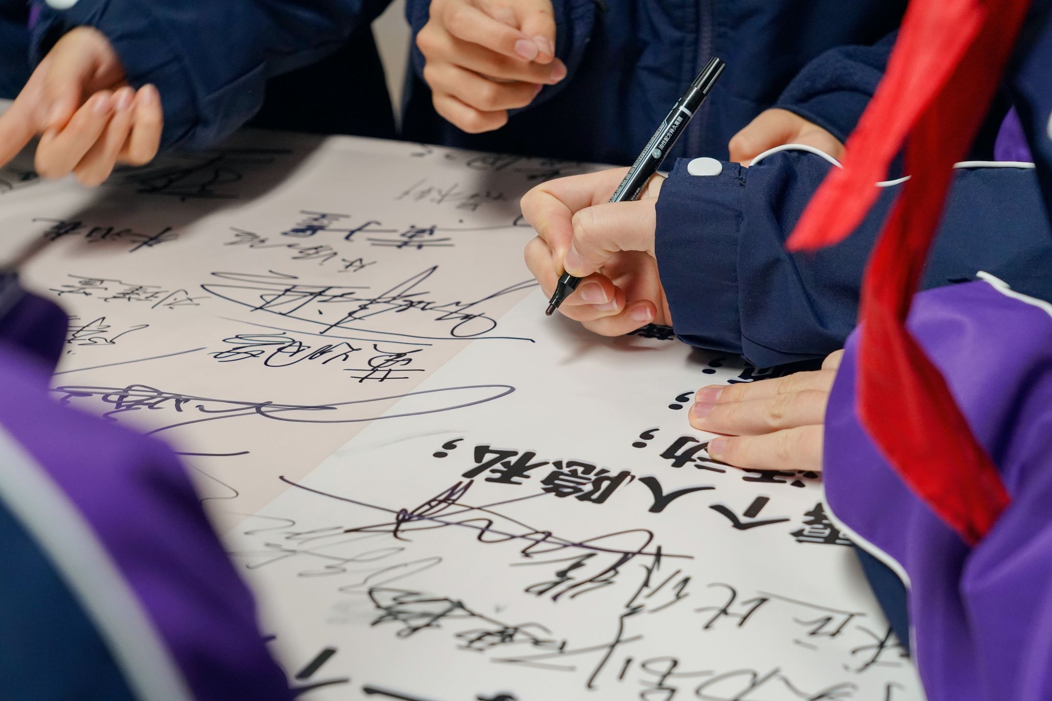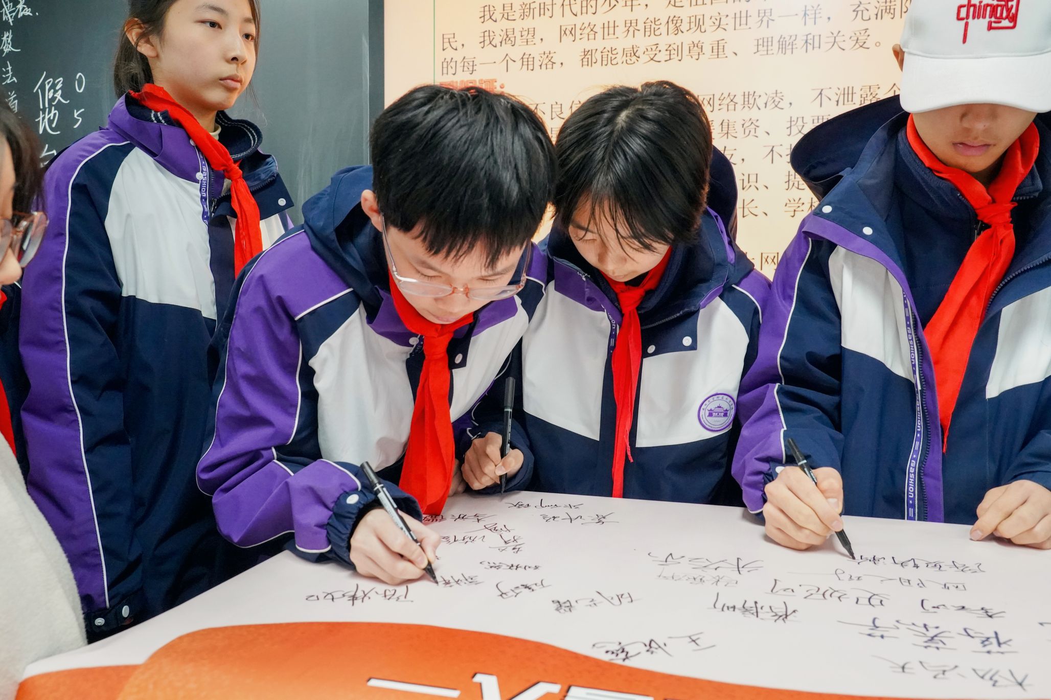 主题活动的第三环节是共同签署守法宣言书,领取印有《条例》第26条、第45条的书签。同学们依次上台在守法宣言书上郑重签上了自己的名字,班主任王荟老师带领同学们将这份宣言书悬挂在班级醒目的一角,时刻提醒同学们做一名懂法、守法的中学生。至此,活动圆满结束。