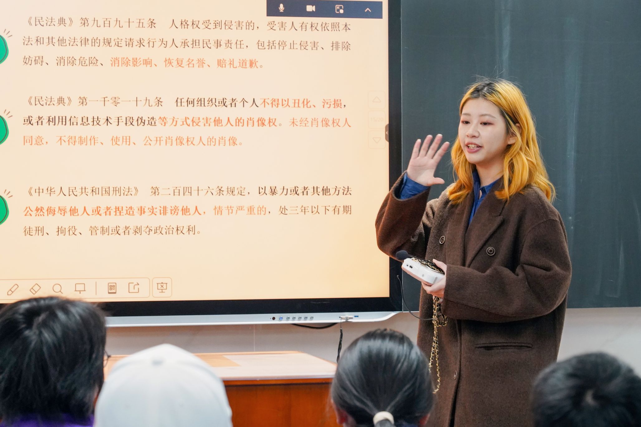 陈樱同学说:在这次普法宣传活动中,虽然上课时间短暂,但我深刻体会到了同学们渴求知识的活力与热情。本次课程中,我们将法律知识与同学们日常生活紧密结合,用实际案例和同学们分享了参与投票打榜此类的追星活动可能面临的法律责任与法律风险,不仅增强了他们的法律意识,还培养了他们学以致用的能力。这种改革创新的教学方式,让同学们在实践中学习法律,理解法律,运用法律,同时又有效地提升了思政课的吸引力和实效性,我很荣幸能够参与此次活动。
