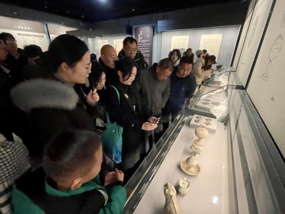 接着,师生们在二楼依次游览了“楚玉撷英——荆州出土玉器展”“书于竹木——荆州出土简牍展”“陶苑奇珍——荆州出土古代瓷器展”。随着一件件文物瑰宝和考古成就展现在眼前,师生们认真聆听着讲解员生动全面的介绍并不时提问,既领略到秦式、中山式、越式、东夷式等不同形制玉器的精美,又得以解读两千年前简牍承载的文化密码,还窥探到古代地区经济繁荣背景下瓷器文化的发展脉络。众多珍品中,精美的玉覆面及其“五官偏斜”之谜、记述翔实的简牍及古代狱讼之公和“十大最美馆藏文物”之一的青釉荷叶形盖罐令人印象深刻,激发了师生强烈的文化自信和保护传承发展好文化遗产的历史责任感。