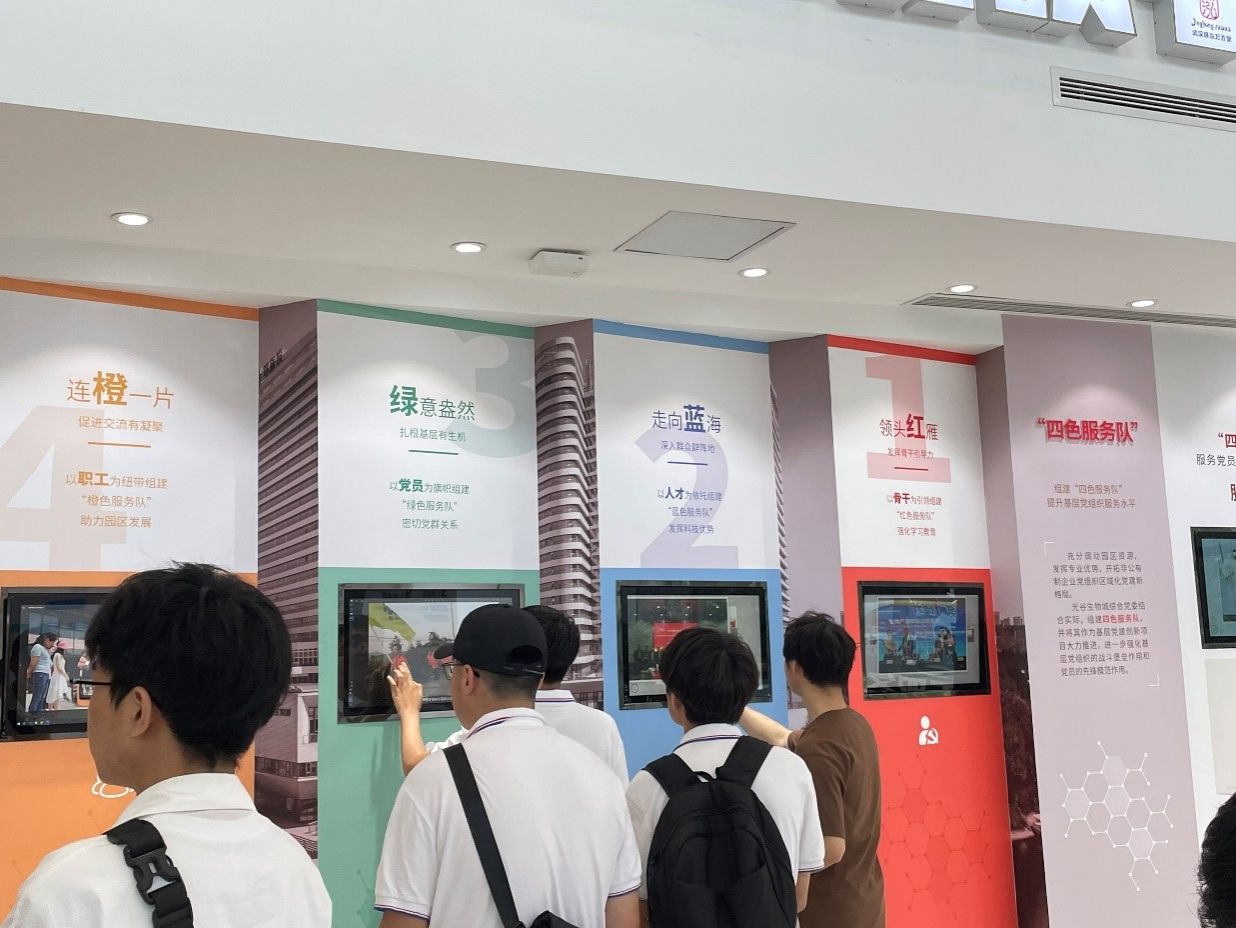 最后,实践教学队伍到达第三站——生物城综合党委大厅,参观学习“四服务·一提升”、“三张清单·一平台”党建工作成果。李敦强副书记围绕生物城产业发展、党建工作等内容与同学们展开交流,并阐述了生物城产业兴国、科技报国的重大成果和重要意义。同学们在交流中学习到,党组织不仅是生物城的领导组织者,更是群众的服务者和企业的贴心人。