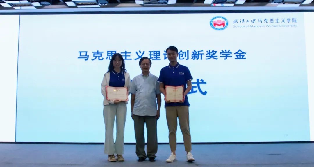 赠书仪式结束后,马克思主义理论创新奖学金捐设者、院友毛道福先生为第三届马克思主义理论创新奖学金获奖同学代表胡欣欣、徐海辰同学颁奖。