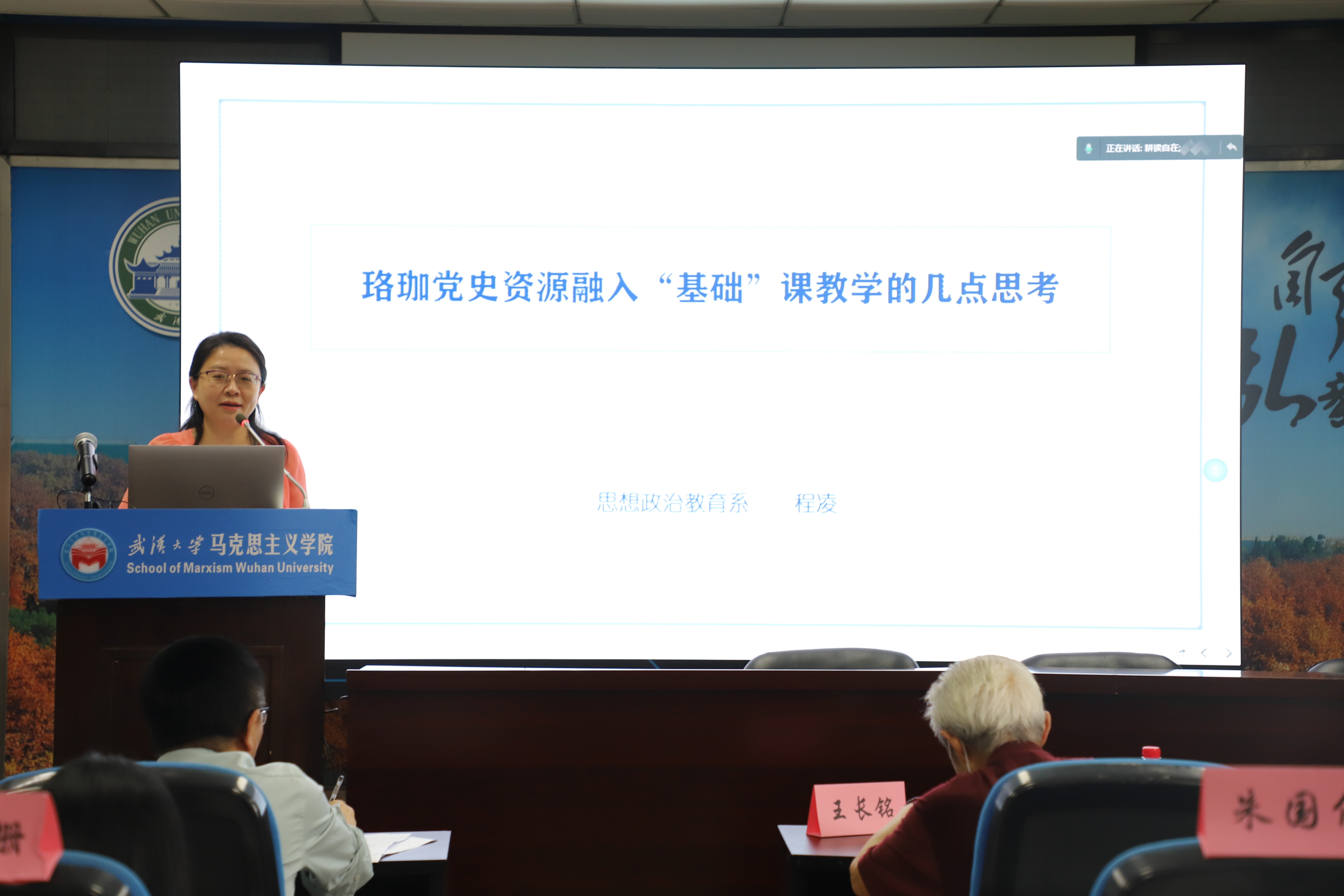 思想政治教育系教师党支部书记程凌副教授分享了他对于珞珈党史资源融入“思想道德修养与法律基础”课教学的思考。程凌指出:珞珈党史资源融入“基础”课教学是以习近平总书记在党史学习教育动员大会上的重要论述为根本遵循,将发生于珞珈山上的重大党史事件、重要党史人物、主要党史场馆、经典党史故事、重点党史文献等校园党史资源精心整合,以多种形式全面融入到“基础”课的教学之中。该课程共分为思想、道德、 法治三个板块,应做到故事引入学党史、启发讨论思党史、身体力行践党史、情景体验悟党史,从而着力发扬武大红色基因、凝聚武大青春力量。