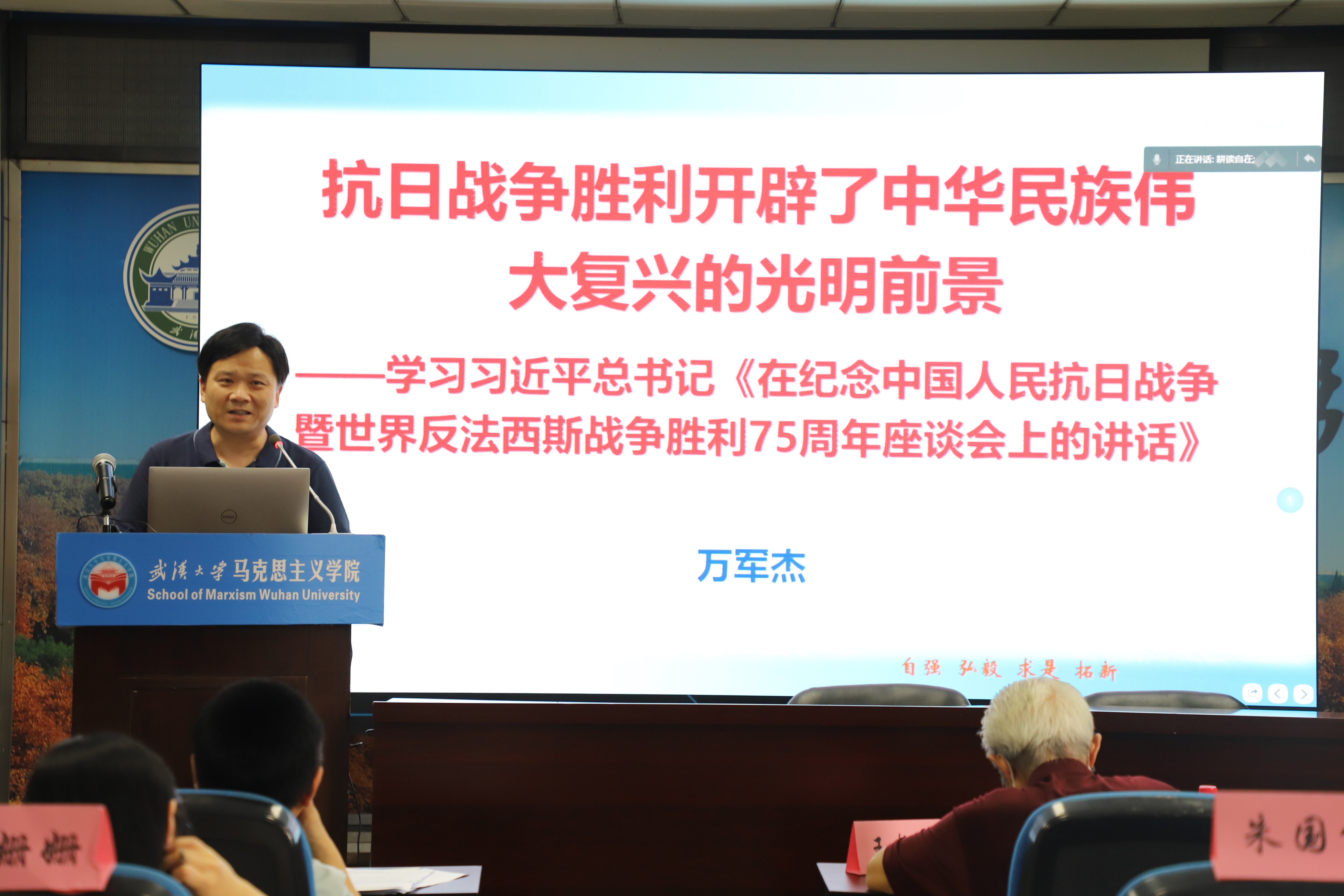 中共党史党建系教师党支部书记万军杰副教授以习近平总书记《在纪念中国人民抗日战争暨世界反法西斯战争胜利75周年座谈会上的讲话》为切入点,从中国抗日战争在世界反法西斯战争中的贡献、中国共产党在抗日战争中的中流砥柱作用、抗战胜利是中华民族走向伟大复兴的起点这三个方面进行了阐述。万军杰指出:中国抗战史在百年党史中的地位重要,中国战场是世界反法西斯战争中最早的反法西斯战场和东方主战场,对法西斯的侵略行径起到了重要牵制作用。而中国共产党通过积极倡导、促成、维护抗日民族统一战线,制定和坚持全面抗战的路线和政策,并领导抗日军民开辟敌后战场,动员人民、依靠人民,最大限度地动员了全国军民共同抗战,支撑起全民族救亡图存的希望。抗日战争的胜利意味着近代以来中国人民在反对外国侵略战争中第一次取得完全胜利的民族解放斗争。中国树立起了负责任的大国形象,赢得国际声誉和地位,并为建立新中国奠定重要基础。