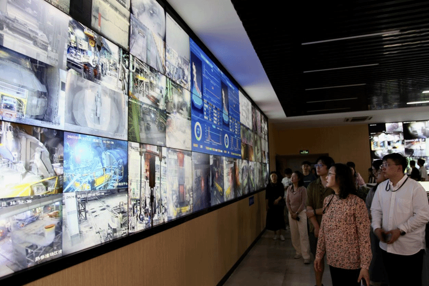 在国内首家全流程、全产线集中操作控制中心的5G炼钢操控中心,讲解人员向师生们介绍了操控中心以工业互联网平台为驱动,通过现代化的科学调度系统保障生产安全、提升生产效率的举措与成效。师生们观摩操控中心的智慧屏幕,感受融合实时监控、生产指挥、智慧管控的高效智能化生产模式对钢铁生产的科技赋能。