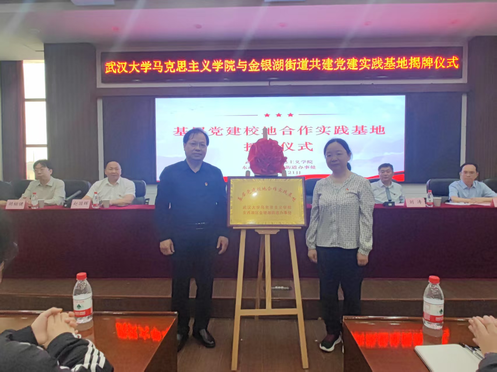 实践教学行程最后,师生们来到金银湖街道办事处701会议室,参加“基层党建校地合作实践基地”揭牌仪式。来自区委组织部、区委直属机关工委等单位的领导参与本次授牌仪式。仪式由街道党工委副书记赵国辉主持,武汉大学马克思主义学院领导、教师,东西湖区委组织部代表和金银湖街道相关负责人共同出席。