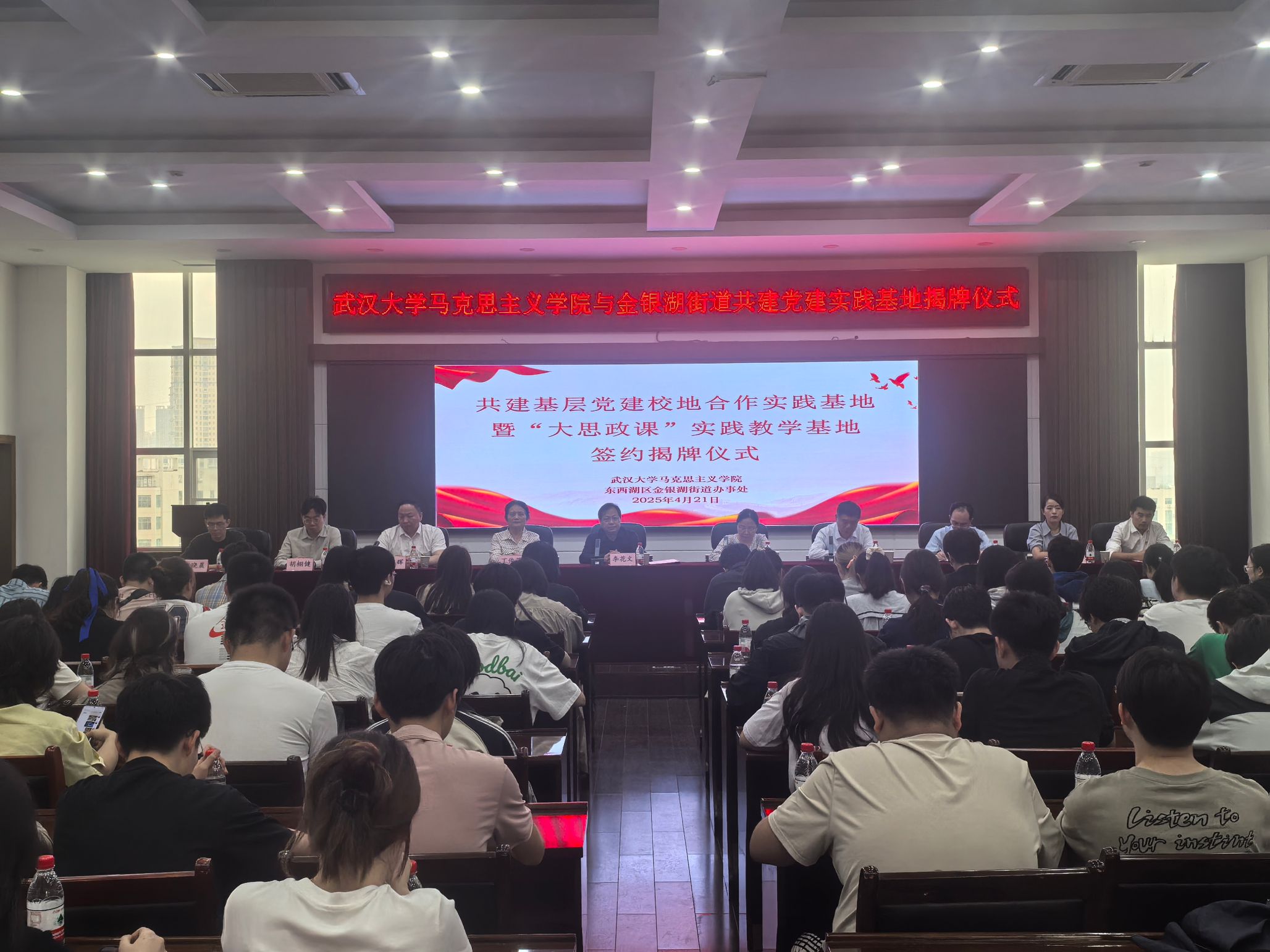 4月21日上午,武汉大学马克思主义学院与东西湖区金银湖街道合作共建基层党建校地合作实践基地暨“大思政课”实践教学基地。本次活动是武汉大学马克思主义学院在推进“大思政课”建设过程中的又一重要举措,旨在进一步拓展思政教育的实践渠道,推动思政小课堂与社会大课堂的紧密结合。本次活动由学院党委副书记孙燕带队,丁俊萍教授、李向勇教授、团委书记胡栩健老师以及“中国共产党建设的理论与实践”课程教师李雅丽、课程助教何炫达和李秉鸿以及2022级本科生共同参加。