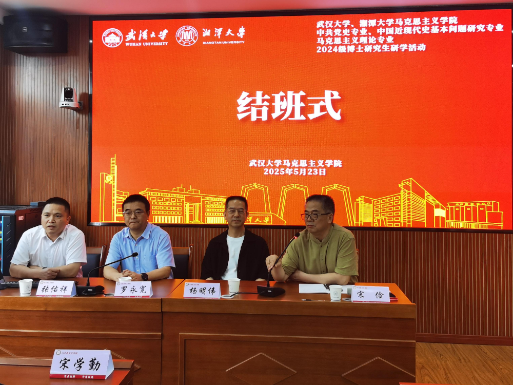 经过几天的深入学习和广泛交流,本次研学活动取得了良好效果。5月23日下午,研学结班式在湘潭大学马克思主义学院举办,杨明伟、张佑祥、罗永宽等出席结班式并讲话,武汉大学和湘潭大学的四位博士生代表分享了研学体会。宋俭教授在总结发言中,感谢中共中央党史和文献研究院对外合作交流局、湘潭大学马克思主义学院与武汉大学马克思主义学院的通力合作,表示此次研学不仅是一次学术之旅,更是一次精神洗礼,希望博士生们能将所学所感转化为科研动力,在未来学术道路上潜心探索、不断进步。