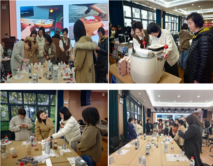 老师们围在操作台旁认真学习和练习,按照培训师讲解的步骤认真研磨咖啡豆、萃取咖啡液、打发奶泡、尝试拉花,报告厅内弥漫着咖啡醇厚的香味,伴随着操作声、交流声和惊喜声,学习氛围格外浓厚。