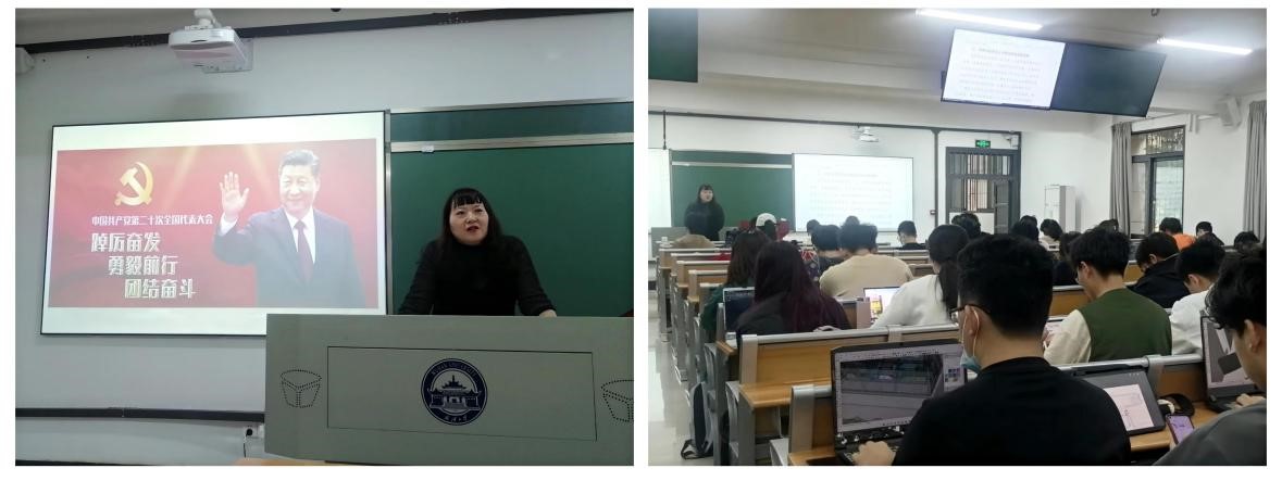 刘钒副教授还分享了自己采取“视频+讲解”的方式进课堂,一方面选取开幕式、分组讨论、代表采访等各类视频,在课堂上向同学们展示;另一方面,结合自己的学习体会和专家学者的阐释解读,在课堂上讲解报告的核心要点。例如,“毛泽东思想和中国特色社会主义理论体系概论”课程把报告对习近平新时代中国特色社会主义思想的最新概括和评价,融入到第八章“习近平新时代中国特色社会主义思想及其历史地位”的课堂教学中。他还表示,在课程时间允许的情况下,待大会闭幕后,将有计划地组织同学结合授课内容、所学专业展开讨论或辨析。