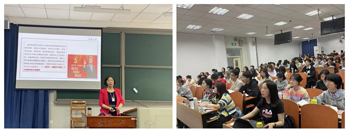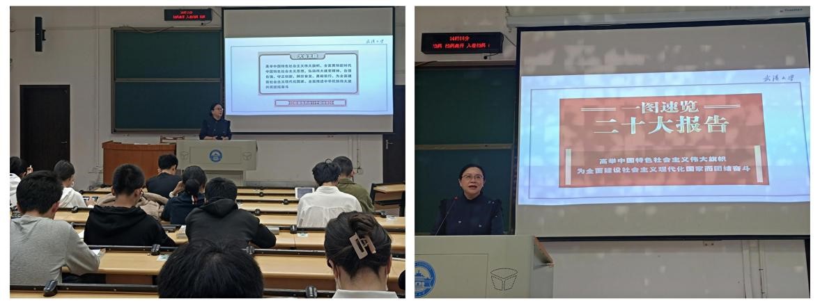 课后,同学们反响热烈,纷纷表示教师们在思政课堂上对党的二十大报告及时深入的讲解十分解渴,催人奋进。武汉大学马克思主义学院承担着全校的思政课教学任务,学院将继续深入学习贯彻党的二十大精神,落实“立德树人”根本任务,组织全体思政课教师用情、用心、用力将党的最新理论成果融入思政课堂,推动青年学子继续为建设中国特色社会主义现代化强国、实现中华民族伟大复兴而不懈奋斗!