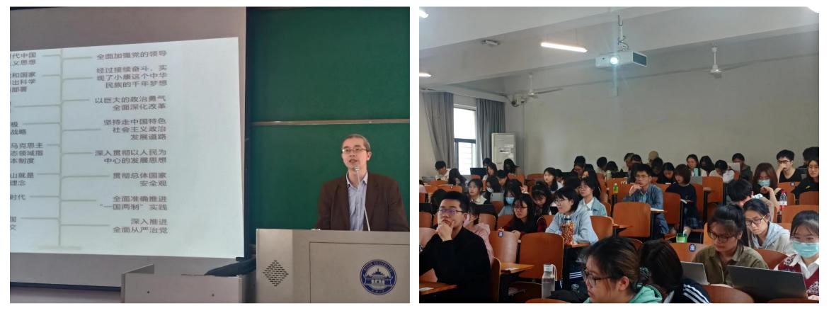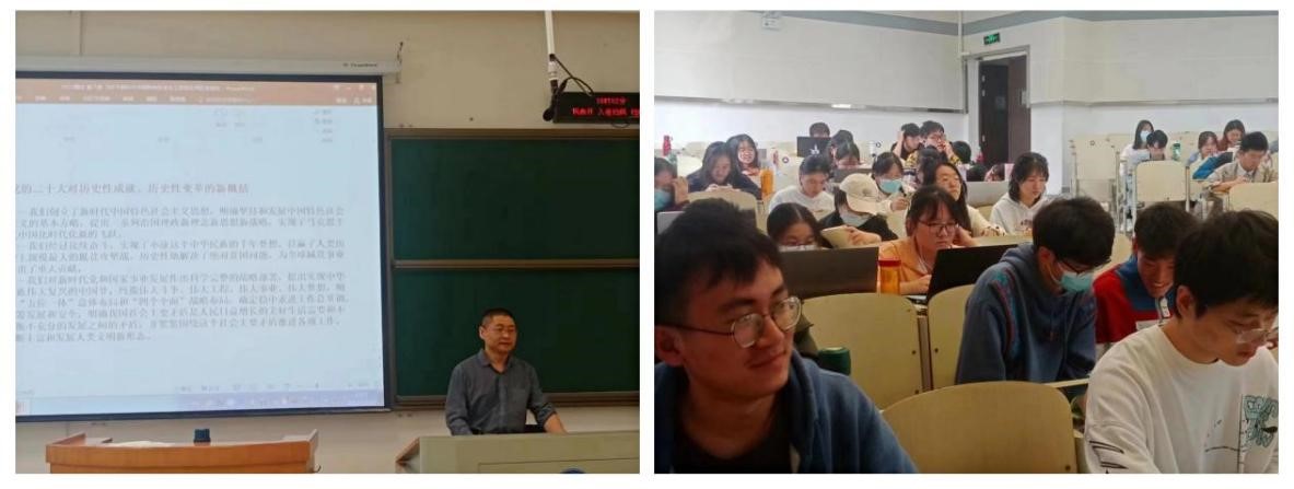 刘钒副教授还分享了自己采取“视频+讲解”的方式进课堂,一方面选取开幕式、分组讨论、代表采访等各类视频,在课堂上向同学们展示;另一方面,结合自己的学习体会和专家学者的阐释解读,在课堂上讲解报告的核心要点。例如,“毛泽东思想和中国特色社会主义理论体系概论”课程把报告对习近平新时代中国特色社会主义思想的最新概括和评价,融入到第八章“习近平新时代中国特色社会主义思想及其历史地位”的课堂教学中。他还表示,在课程时间允许的情况下,待大会闭幕后,将有计划地组织同学结合授课内容、所学专业展开讨论或辨析。